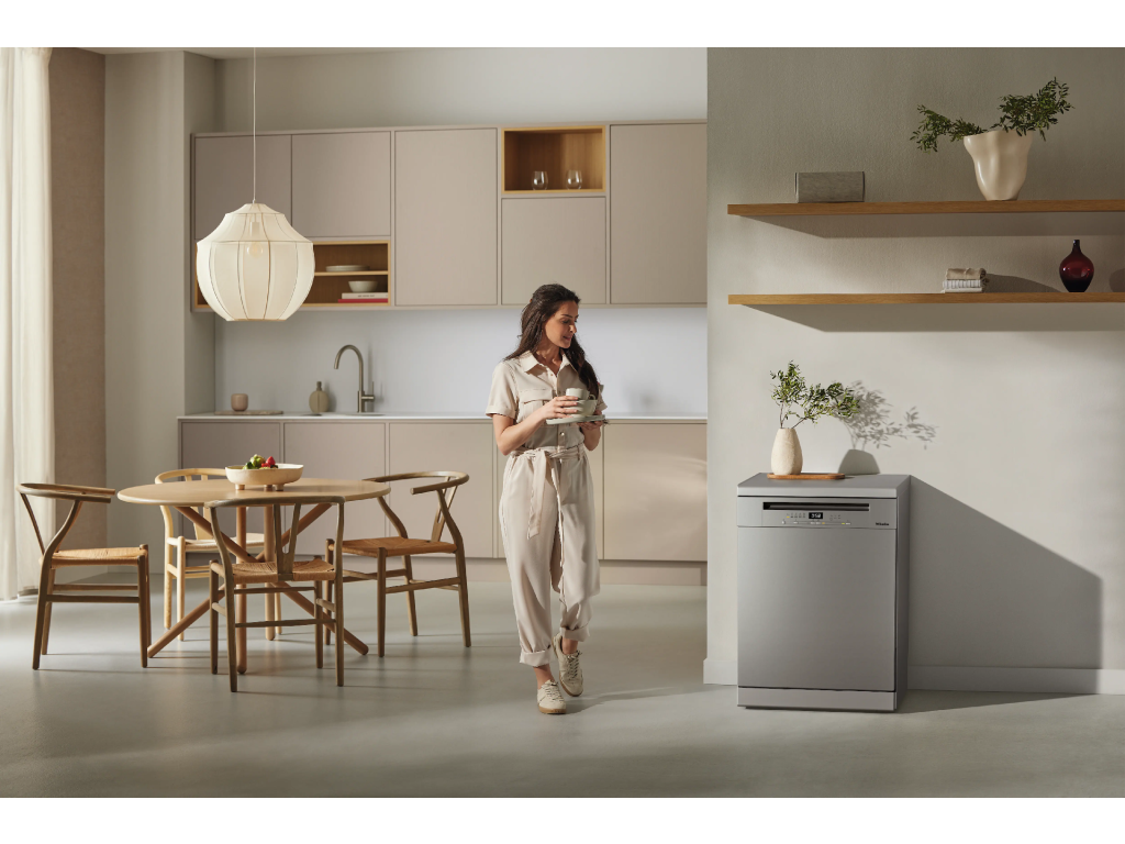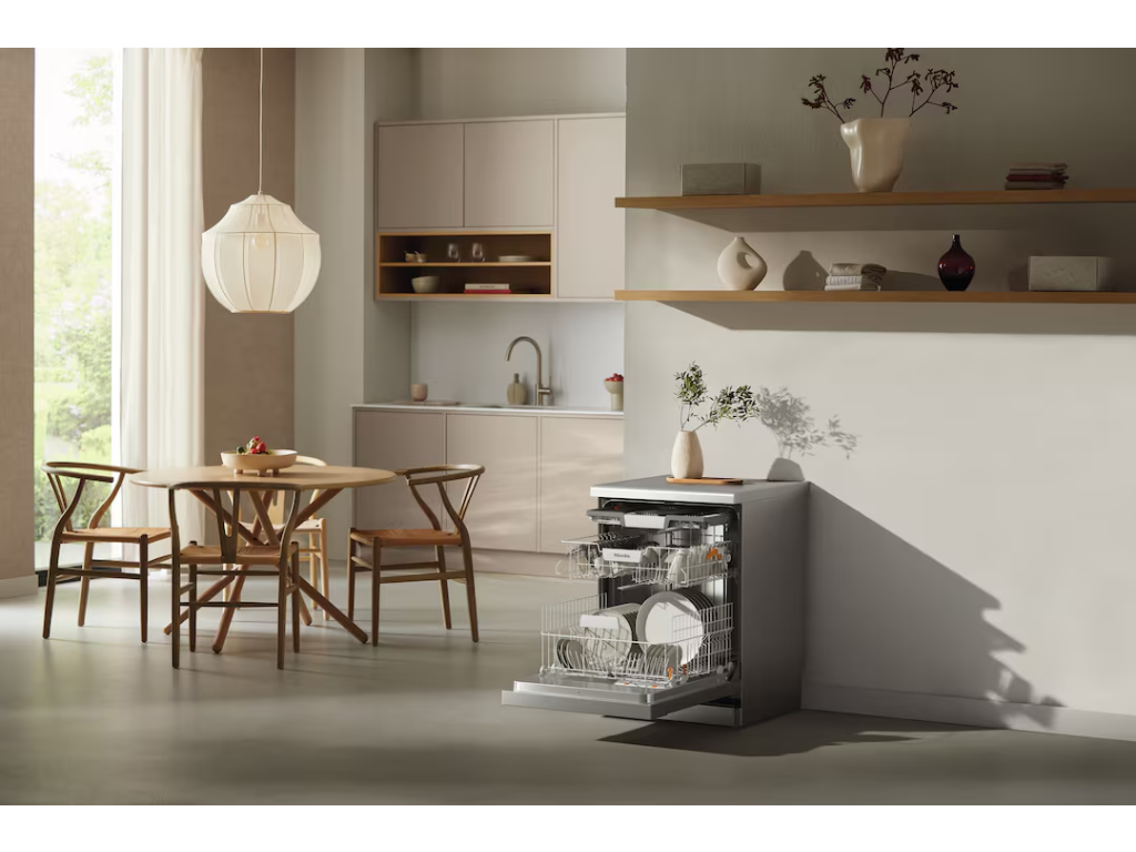 Volně stojící myčka nádobí v nerez designu s funkcí AutoOpen pro optimální výsledky sušení díky automatickému otevírání dvířek po dokončení mytí.